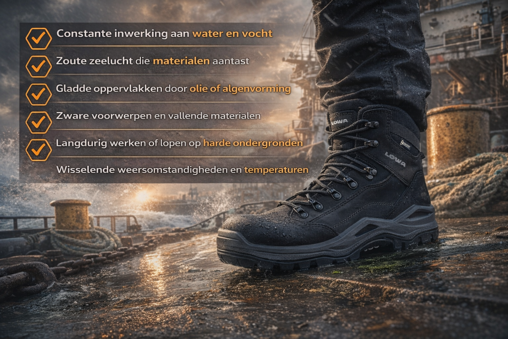 Werken in de maritieme sector vraagt veel van jouw materiaal. Of je nu actief bent in de binnenvaart, offshore, havenlogistiek of scheepsbouw: je staat dagelijks op natte dekken, gladde oppervlakken en oneffen ondergronden. Water, olie, zout, zware materialen en wisselende weersomstandigheden maken jouw werkplek intensief en soms onvoorspelbaar.