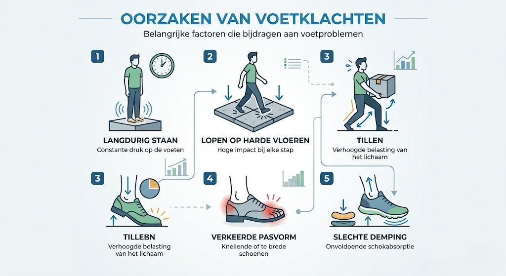 Vaak komt dit door een verkeerde pasvorm, te weinig ondersteuning, versleten zolen of langdurig staan en lopen op harde vloeren.