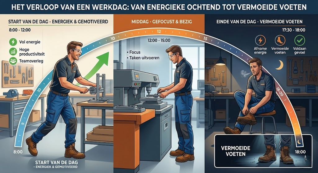 Wie lange dagen maakt op werkschoenen, merkt het vaak als eerste aan de voeten. Aan het begin van de dienst gaat het nog prima. Maar na een paar uur lopen, tillen, draaien of stilstaan worden voeten zwaar, branderig of pijnlijk. Soms trekt die pijn zelfs door naar de knieën, heupen of onderrug.