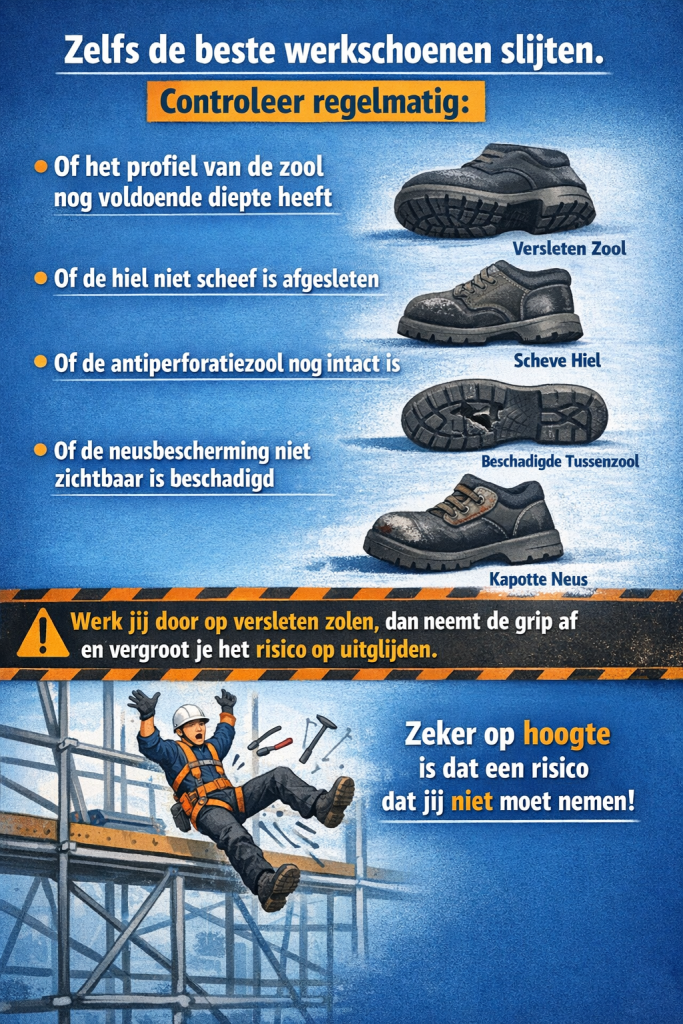 Niet elke veiligheidsschoen is ontwikkeld voor werken op hoogte. Veel standaard werkschoenen zijn ontworpen voor bouwplaatsen op de begane grond of industriële omgevingen met vlakke vloeren. Als jij daarmee een hellend dak op gaat, loop je tegen beperkingen op.