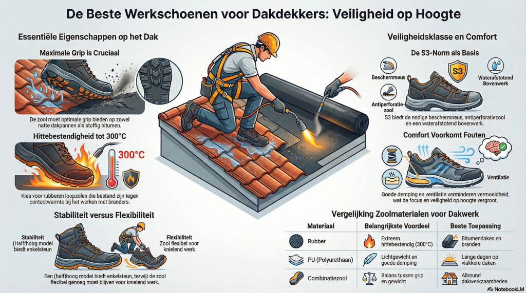 Een van de belangrijkste verschillen zit in de buitenzool. Op een dak heb jij maximale grip nodig, vooral bij vocht of vuil. Een zool die in een magazijn prima functioneert, kan op een hellend pannendak tekortkomen. Daarnaast is flexibiliteit essentieel. Wanneer jij veel knielt of je voeten schuin plaatst, moet de schoen met je meebuigen.