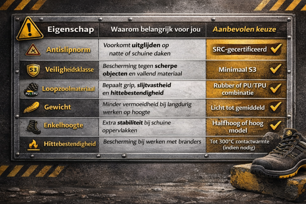 Let daarom altijd op de volgende criteria wanneer jij werkschoenen voor dakdekkers kiest: