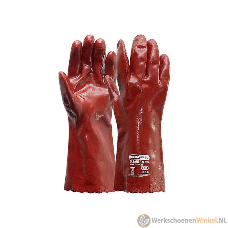 De OXXA Cleaner 17-035 is een werkhandschoen die compleet een PVC-coating hebben. Hierdoor is er sprake van een zeer betrouwbare bescherming tegen olie, vetten en vloeistoffen. De binnenzijde is van jersey katoen wat voor een hoge draagcomfort zorgt, ook bij langdurig gebruik. De OXXA Cleaner 17-035 heeft een lengte van 350 mm en een dikte van 1,1 mm, hierdoor biedt deze handschoen extra bescherming voor onderarmen en handen. De gedipte slip-on manchet maakt het makkelijk om de handschoen aan en uit te trekken. De Sanitized behandeling (dit betekent dat de handschoen een speciale antibacteriële behandeling heeft ondergaan, uitgevoerd door het merk Sanitized) vermindert geuren, houdt de handschoen fris en voorkomt bacterie vorming, ook bij intensief gebruik.